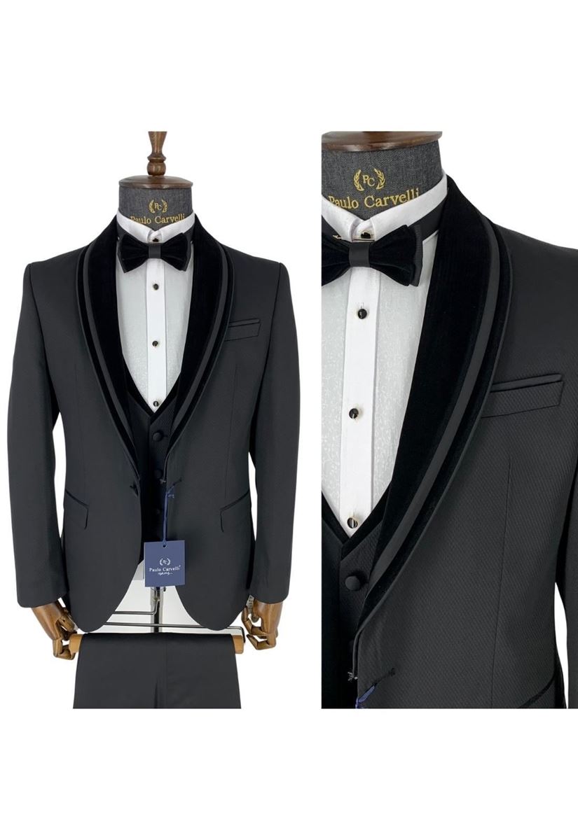 SİYAH ÇAPRAZ ÇİZGİ DESENLİ KADİFE YAKA DETAYLI SMOKİN